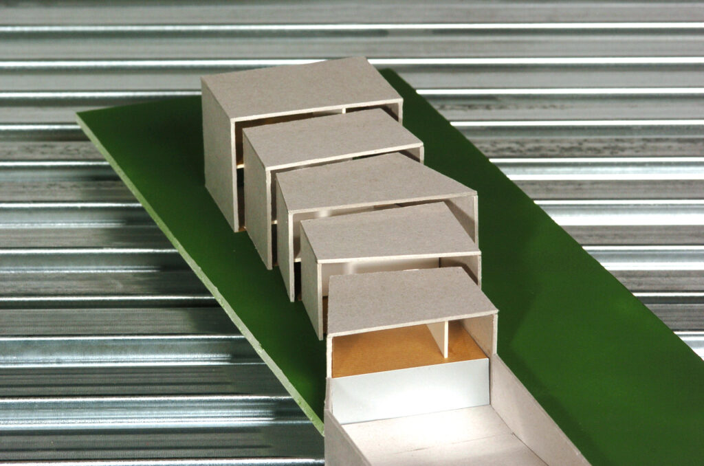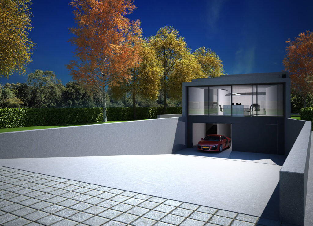 Door de grote ruimtes in het plan naar achter toe te verplaatsen en het dak trapsgewijs op te laten lopen, wordt deze doorkijk gerealiseerd. De zonering die hierdoor ontstaat is perfect. De zakelijke ruimtes als kantoorruimte en garage zijn gelegen aan de straatzijde en de privé ruimtes; de woonkamer, keuken en hoofdslaapkamer aan de tuinzijde.