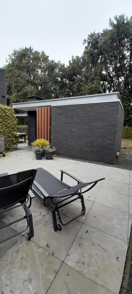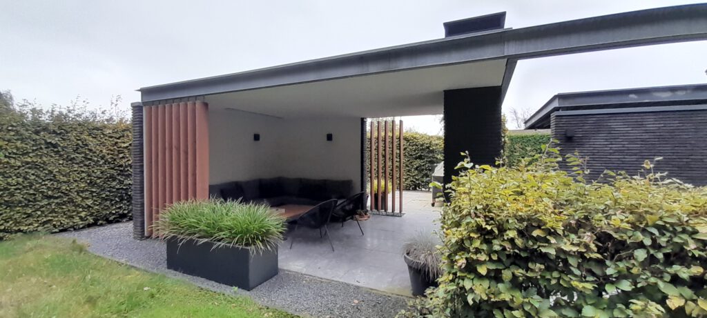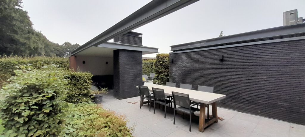 Deze woning die origineel voor de opdrachtgevers is ontworpen is door architect William van Gool heeft een uitbreiding gekregen aan de achterzijde met een buitenzit en een overdekt terras.