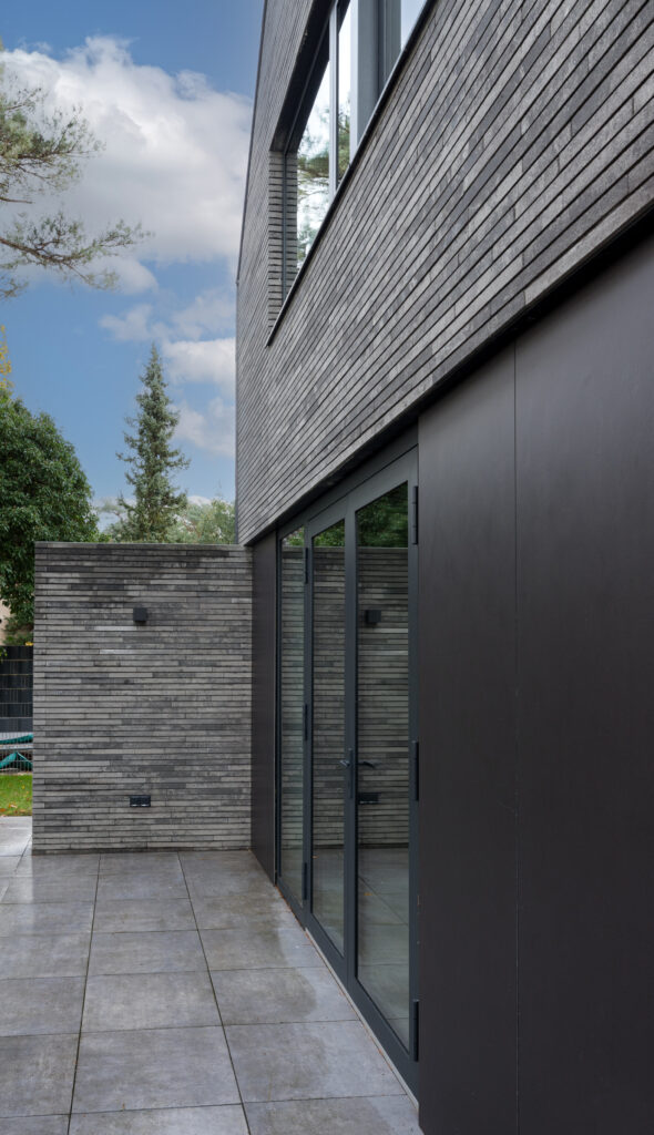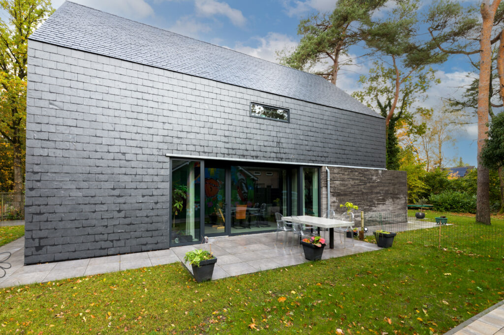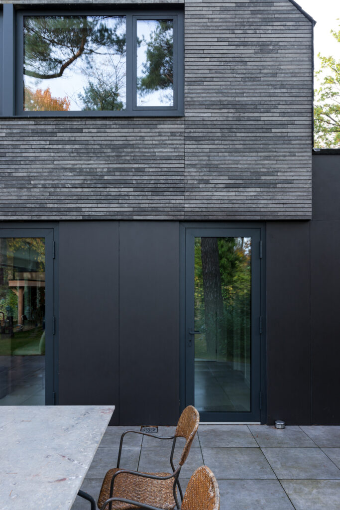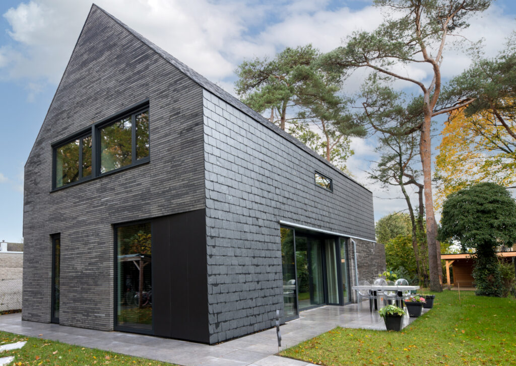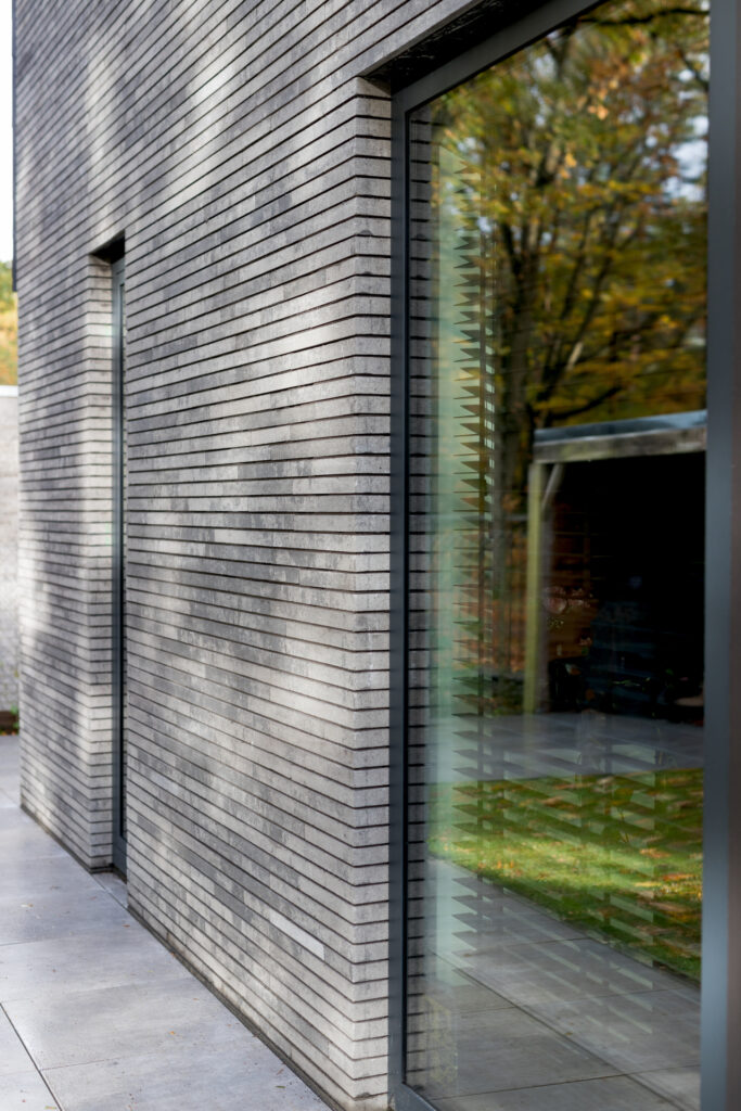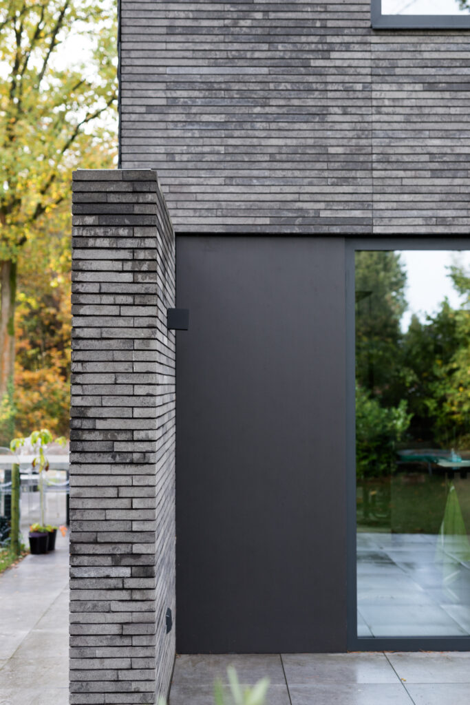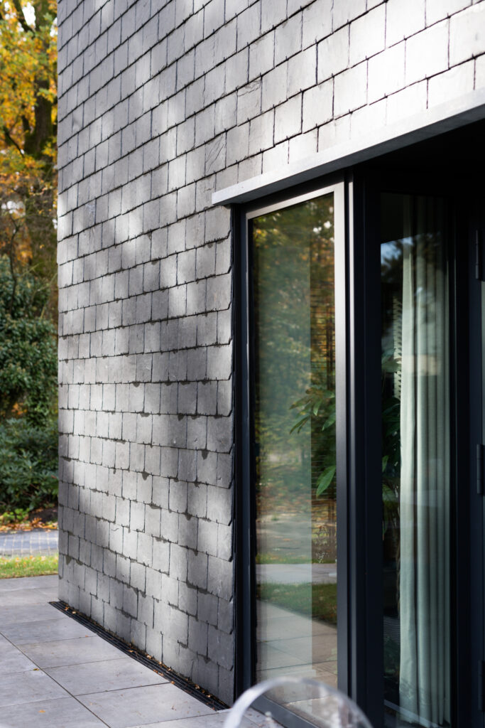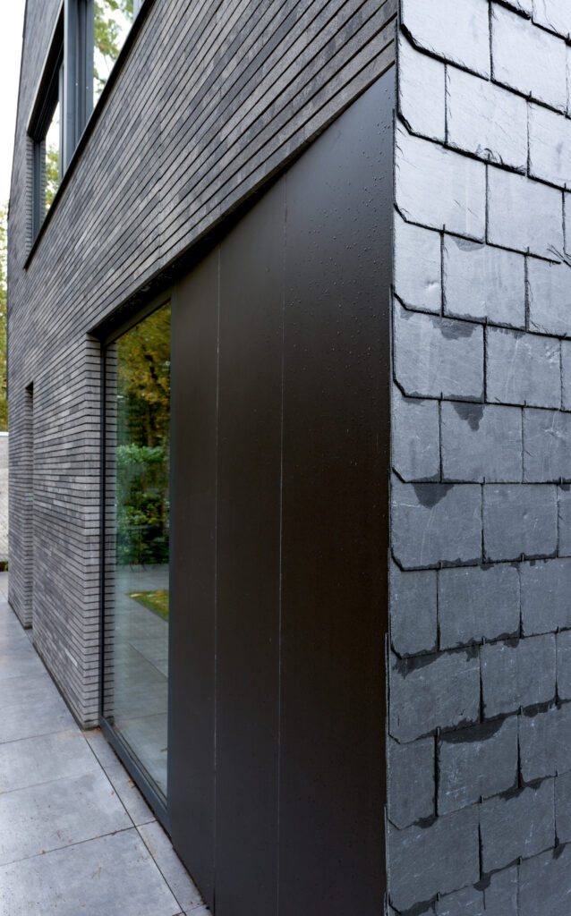 Wat de woning verder onderscheidt, is de strakke detaillering. Met name het punt waar de drie belangrijkste materialen samenkomen valt op. De natuurleien, betonstenen en de antraciete cementgebonden plaat raken elkaar hier zeer subtiel in één punt, alsof er geen materiaaldikte bestaat. Hierdoor ontstaat een krachtig lijnenspel. Het in diepte weglopen van de cementgebonden plaat verzacht de robuustheid van dit detail. De gelaagdheid en dieptesprongen in de overige gevels, evenals het zonder goot doorlopen van de dakleien over de zijgevels, geven de verder eenvoudige opzet van de in elkaar grijpende bouwvolumes de benodigde sculpturaliteit.