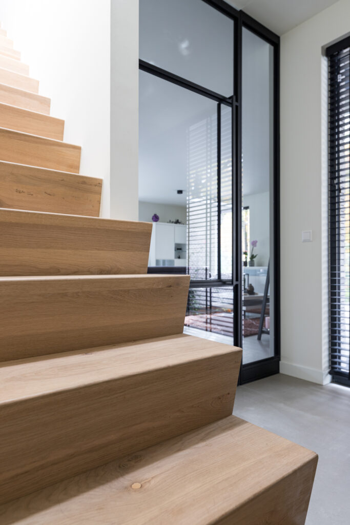 De trap, die buiten de hoofdmassa begint, steekt in lijn met de kap omhoog en doorbreekt plaatselijk het platte dak van de aanbouw. Hierdoor is er een aanzienlijke extra hoeveelheid bruikbare verblijfsruimte op de verdieping en ontstaat er een zeer fraaie, ruime, hoge, rechte steektrap die uitkomt in de entreehal gelegen in de aanbouw aan de zijkant.